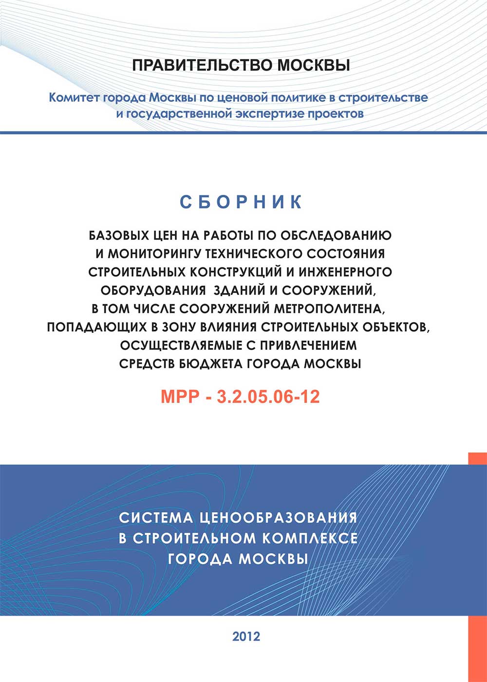 «Сборник базовых цен на работы по обследованию и мониторингу технического состояния строительных конструкций и инженерного оборудования зданий и сооружений, в том числе сооружений метрополитена, попадающих в зону влияния строительных объектов, осуществляемые с привлечением средств бюджета города Москвы. МРР-3.2.05.06-12» утвержден и введен в действие приказом Комитета города Москвы по ценовой политике в строительстве и государственной экспертизе проектов от 04 марта 2013 г. №11.