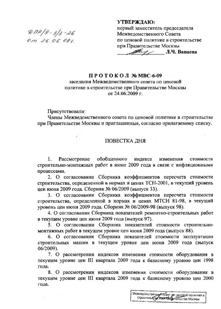 Протокол заседания Межведомственного совета по ценовой политике в строительстве при Правительстве Москвы от 24.06.2009г.