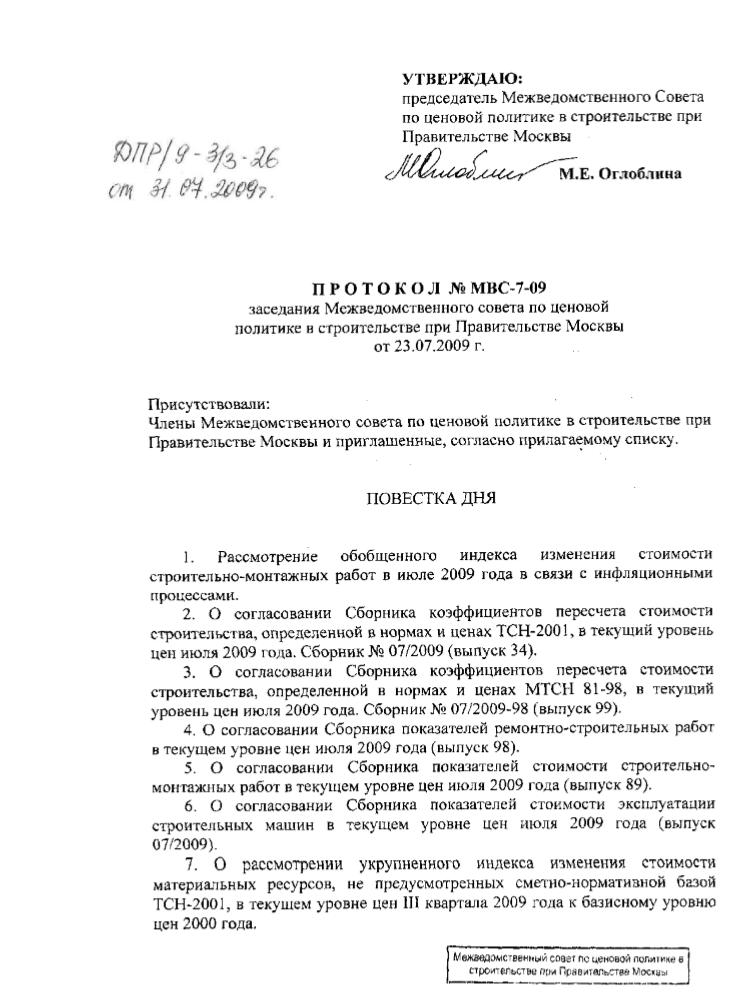 Протокол заседания Межведомственного совета по ценовой политике в строительстве при Правительстве Москвы от 23.07.2009г.