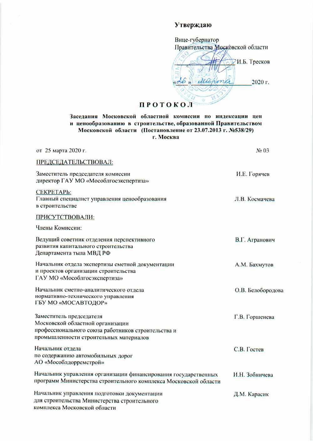 Протокол №03 от 25.03.2020 года заседания Московской областной комиссии по индексации цен и ценообразованию в строительстве по рассмотрению и утверждению сборников расчетных индексов пересчета СМР на март 2020 года к ценам 2000 г.