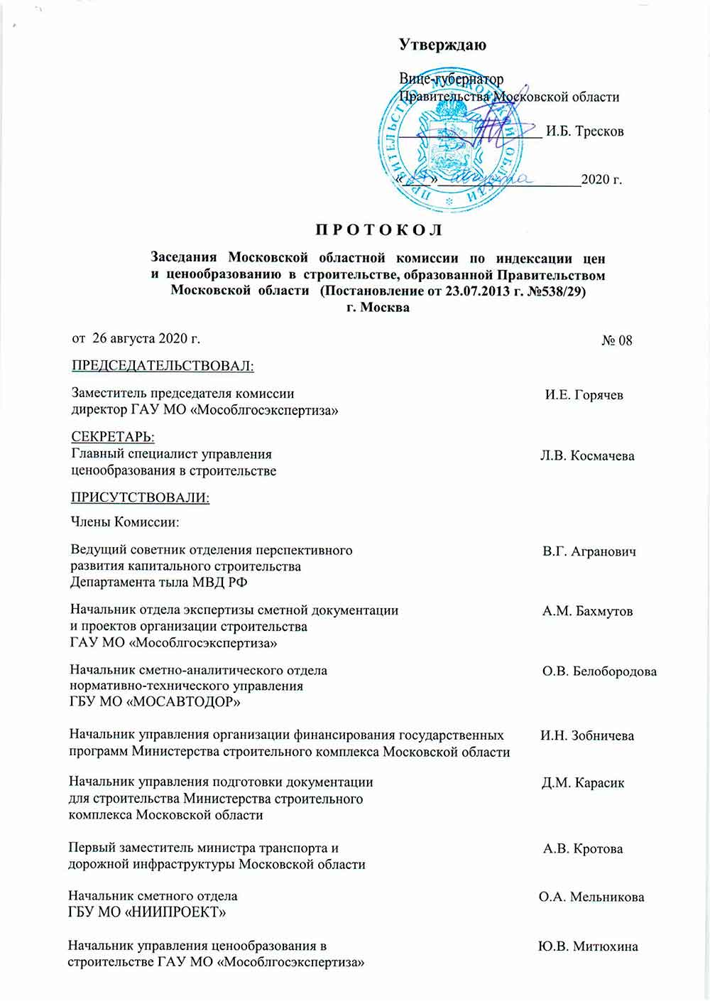 Протокол №08 от 26.08.2020 года заседания Московской областной комиссии по индексации цен и ценообразованию в строительстве по рассмотрению и утверждению сборников расчетных индексов пересчета СМР Август 2020 года к ценам 2000 г.