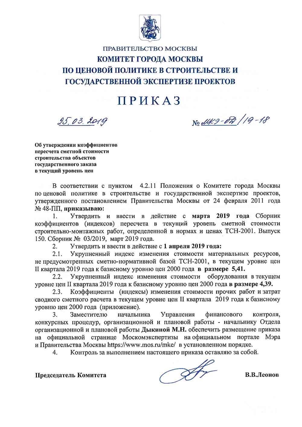 Приказ №МКЭ-ОД/19-18 от 25.03.2019 года Комитета по ценовой политике в строительстве и государственной экспертизе проектов города Москвы «Об утверждении Сборника коэффициентов (индексов) пересчета в текущий уровень цен сметной стоимости строительно-монтажных работ, определенной в нормах и ценах ТСН-2001. Выпуск 150. Сборник № 03/2019, март 2019 г.» содержит:
