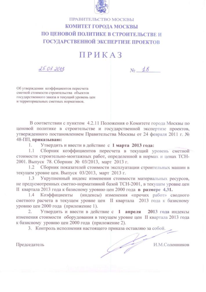 Приказ Москомэкспертизы №18 от 25.03.2013 Об утверждении коэффициентов пересчета сметной стоимости строительства объектов государственного заказа в текущий уровень цен и территориальных сметных нормативов. Содержит: