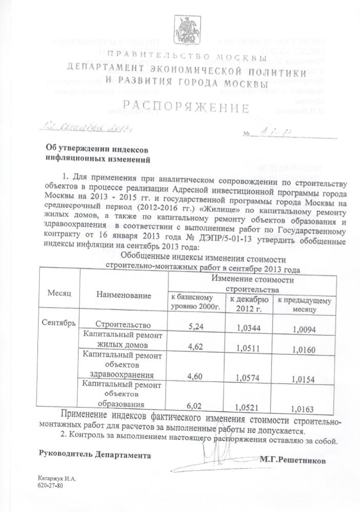 Распоряжение Департамента экономической политики и развития города Москвы № 41-Р от 2 октября 2013 года "Об утверждении индексов инфляционных изменений на сентябрь 2013 года"
