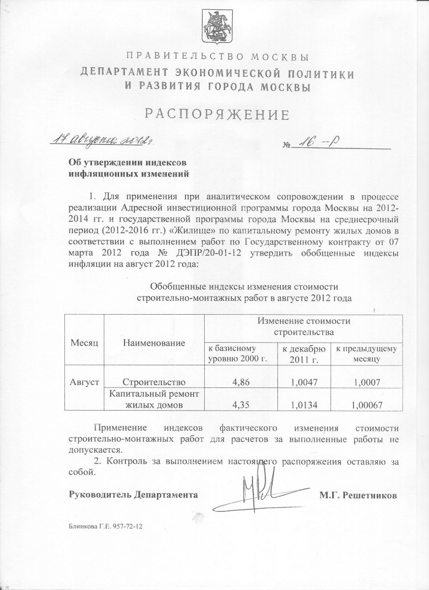 Распоряжение ДЭПИР №16-Р от 17 августа 2012г. «Об утверждении индексов инфляционных изменений на август 2012 года»