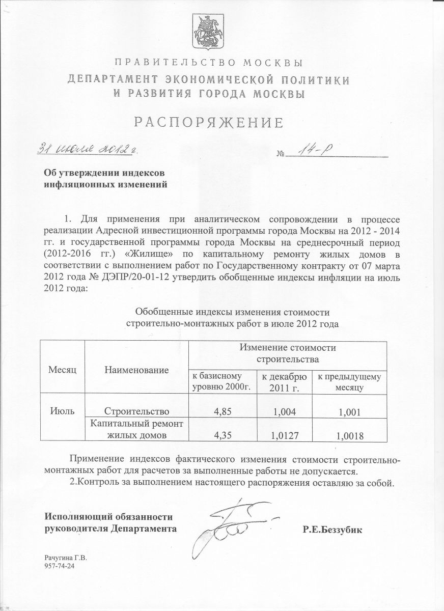 Распоряжение ДЭПИР №14-Р от 31 июля 2012г. «Об утверждении индексов инфляционных изменений стоимости строительно-монтажных работ в июле 2012 года».