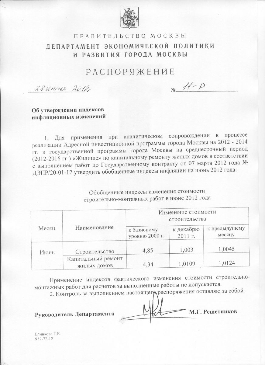 Распоряжение ДЭПИР №11-Р от 28 июня 2012г. «Об утверждении индексов инфляционных изменений»
