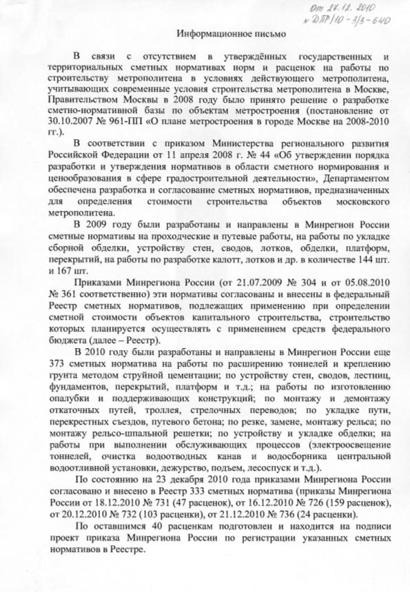Согласно данного письма, по итогам работы в 2009 - 2010 годах разработано 684 сметных норматива, учитывающих современные технологии и методы производства работ при строительстве объектов московского метрополитена, которых, с учетом уже имеющихся в сборнике 29 «Тоннели и метрополитены» ТСН-2001, достаточно для определения сметной стоимости строительства объектов  метрополитена в городе Москве.